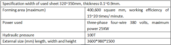 보육 트레이 파종 기계 기술 매개변수 사용시트의 규격폭 : 300~320mm, 두께 : 0.8~2mm. 성형 면적(최대): 400*600 mm, 작업 효율 15~20회/분. 사용전력 : 삼상4선 380V, 최대전력 25KW 수압: 100T 외형치수(mm) 길이, 폭, 높이) 3600mm*980mm*1500mm