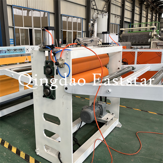 Pvc 미끄럼 방지 매트 장비 소프트 시트 기계: 장비는 주로 단일 나사 압출기, 3개의 롤러 캘린더, 6미터 냉각 브래킷, 고무 롤러 견인 기계, 전단 기계 및 컨베이어 벨트 장치로 구성됩니다.