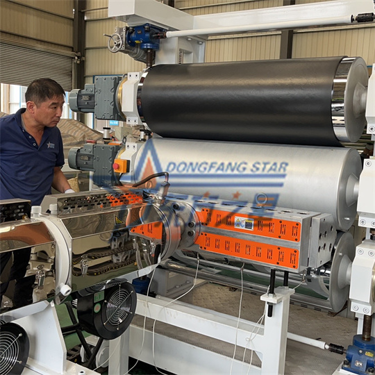 연질 PVC 시트 단일 스크류 압출기 제작 기계 : 장비는 주로 120 단일 스크류 압출기, 3롤러 캘린더, 냉각 브래킷, 고무 롤러 견인 기계, 전단 기계 및